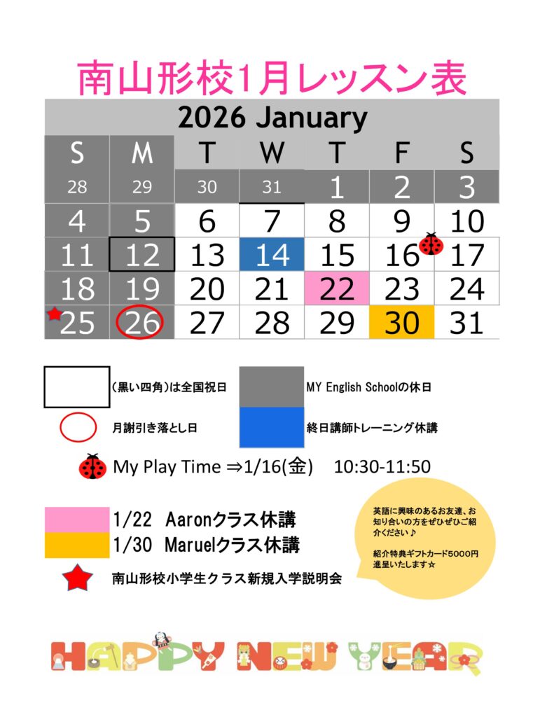 こちら南山形校の1月レッスンカレンダーになります!🐴