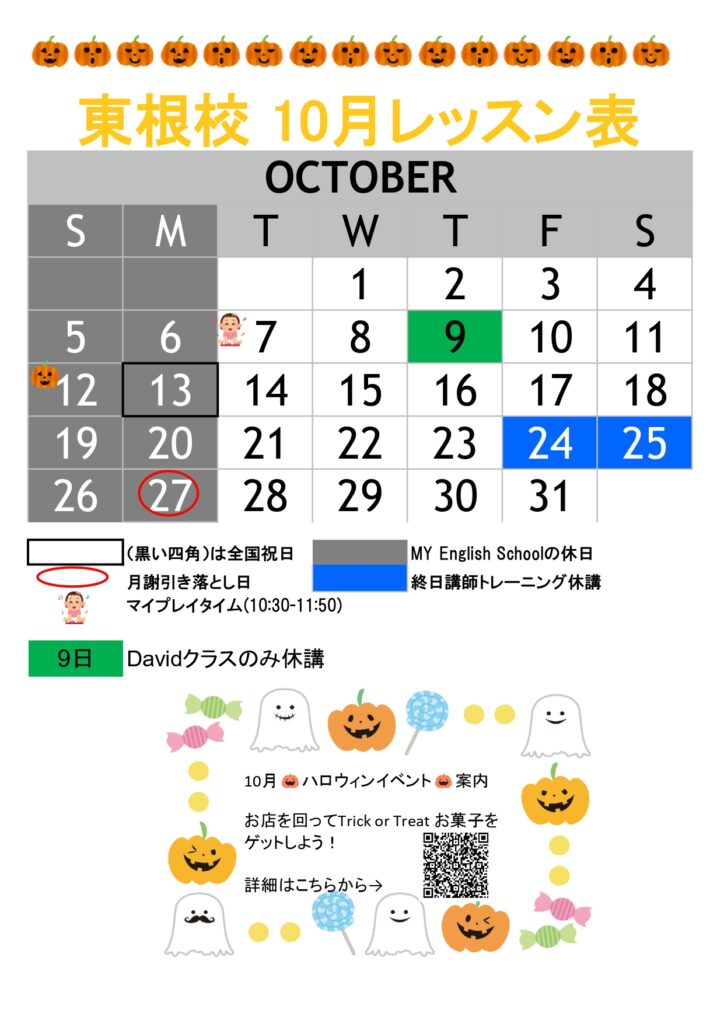 こちら東根校の10月のレッスンカレンダーになります🎃