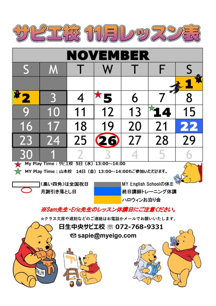 こちらサピエ校の11月レッスンカレンダーになります♬
