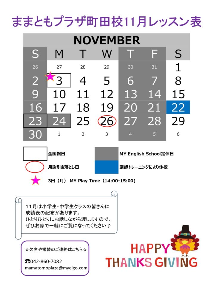 こちらままともプラザ町田校11月のレッスンカレンダーです♬