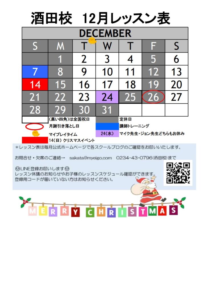 12月28日(日)~1月5日(月)は年末年始休暇のため、レッスンは休講です。