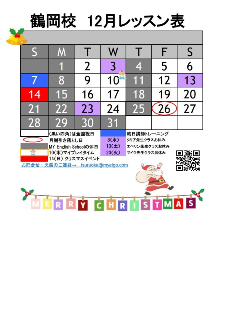 こちら鶴岡校の12月レッスンカレンダーになります!