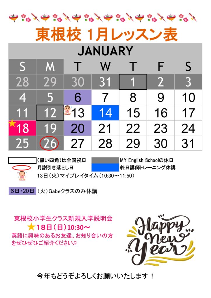 こちら東根校の1月のレッスンカレンダーになります🎍