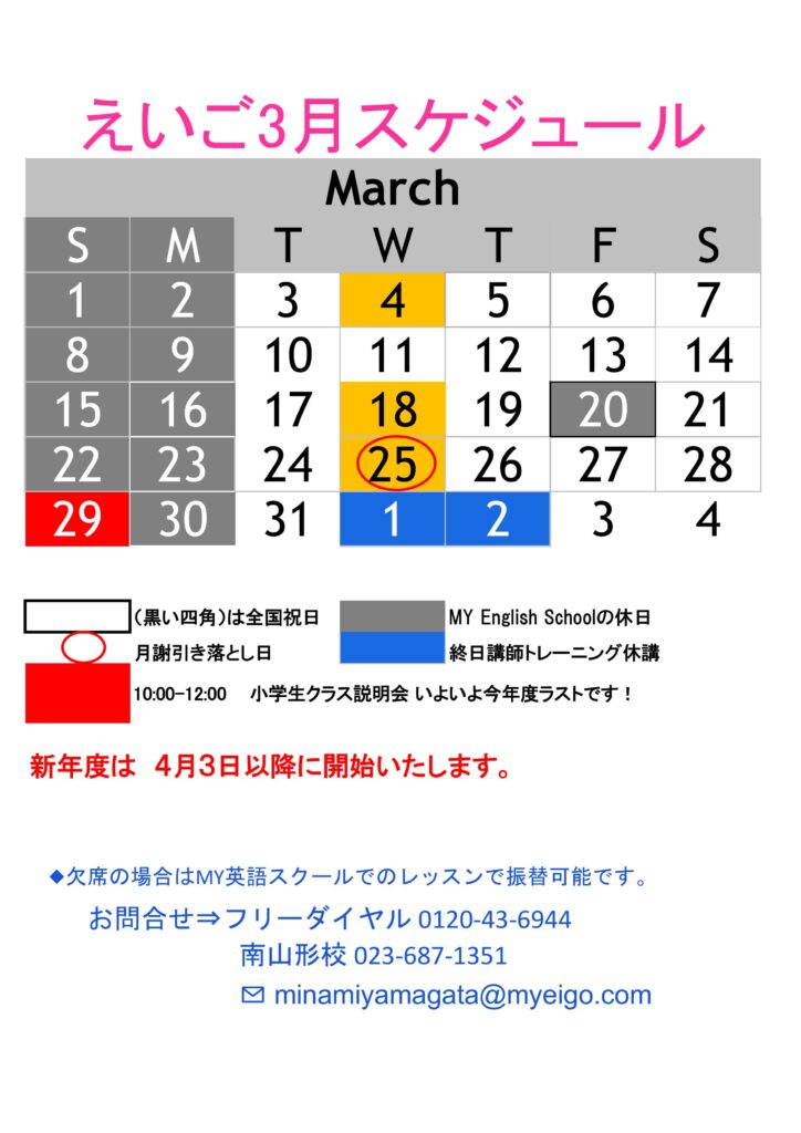 蔵王めぐみ幼稚園3月レッスンカレンダー