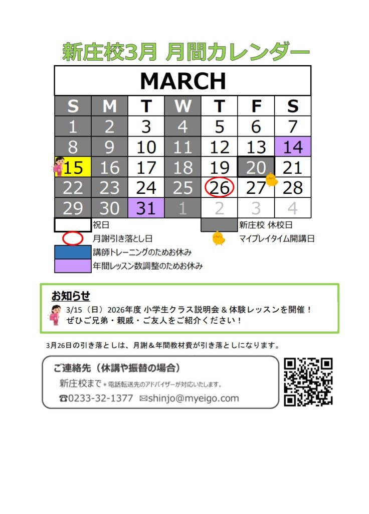 こちら新庄校の3月レッスンカレンダーになります✨