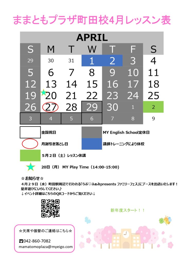 こちらままともプラザ町田校4月のレッスンカレンダーです♬