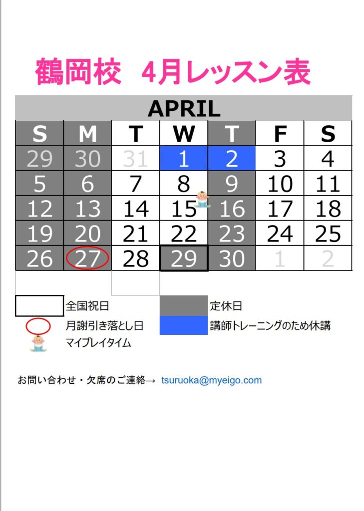 こちら鶴岡校の4月レッスンカレンダーになります🌸