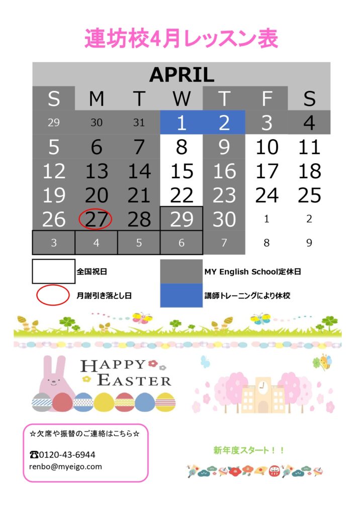 こちら東根校の4月レッスンカレンダーになります!🌸