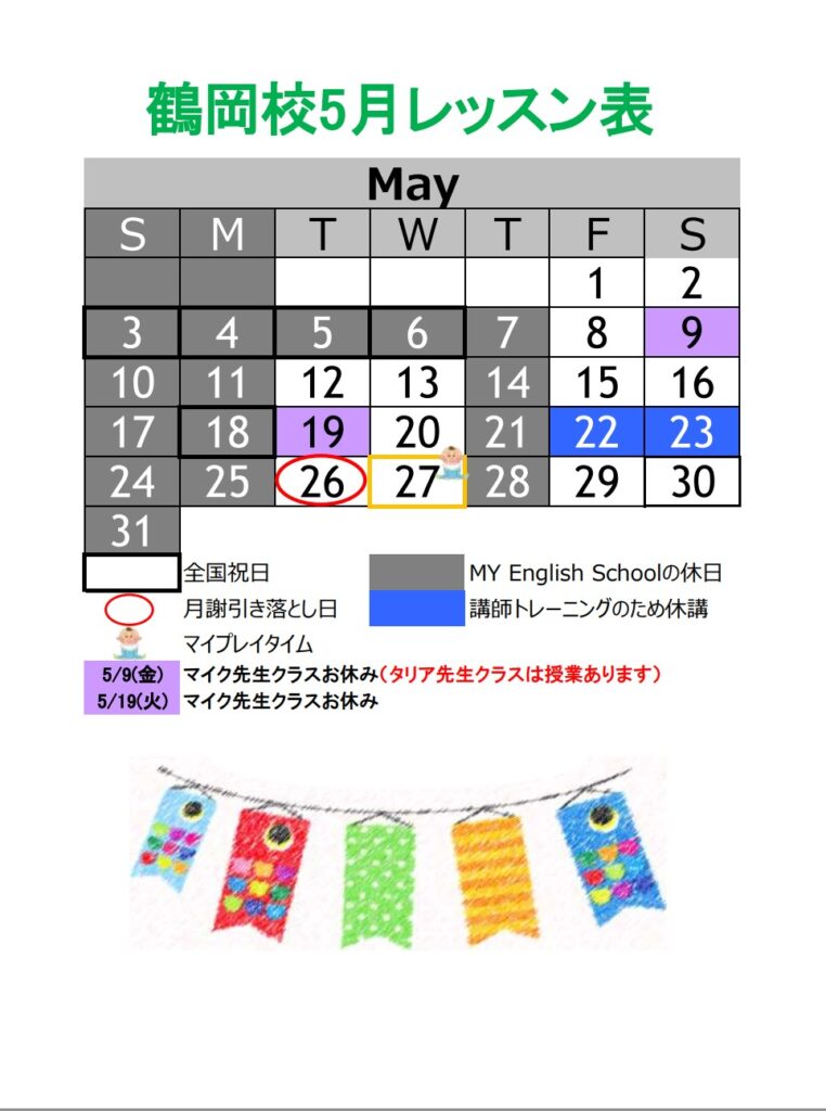 こちら鶴岡校の5月レッスンカレンダーです✨ レッスン休講日がございます。ご注意ください。